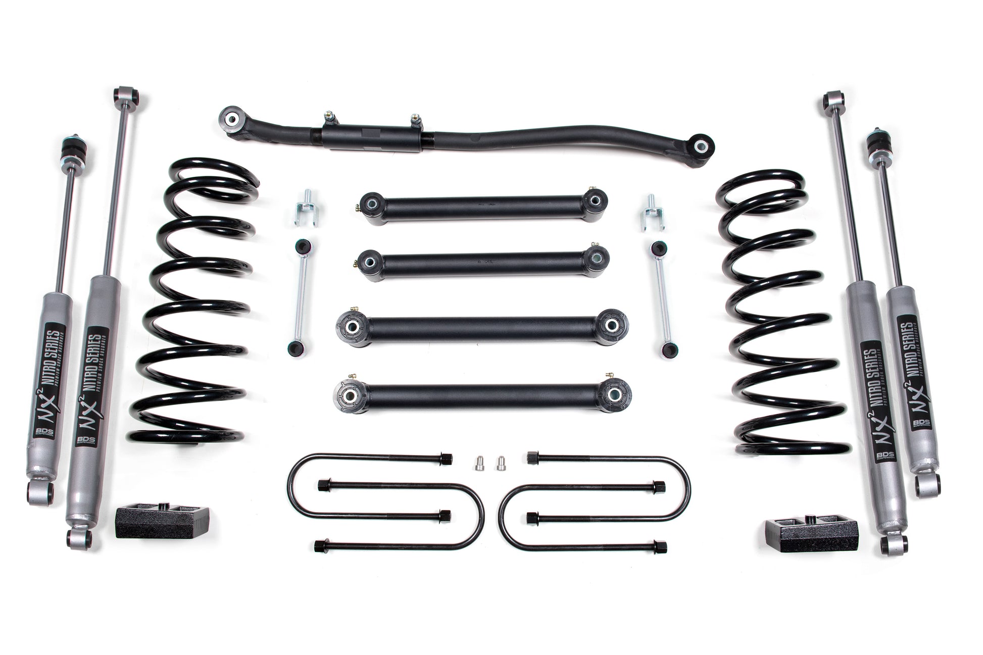 <p>Up front the lift kit includes gas-specific Pro-Ride coil springs, heavy duty adjustable track bar, fixed length tubular upper and lower control arms, fixed length sway bar links with stud eliminator, and precision tuned NX2 or FOX 2.0 nitrogen charged shocks. In the rear this kit utilizes heavy duty cast steel blocks, longer u-bolts, and a matching set of NX2 Nitro or FOX 2.0 Performance shocks.</p>