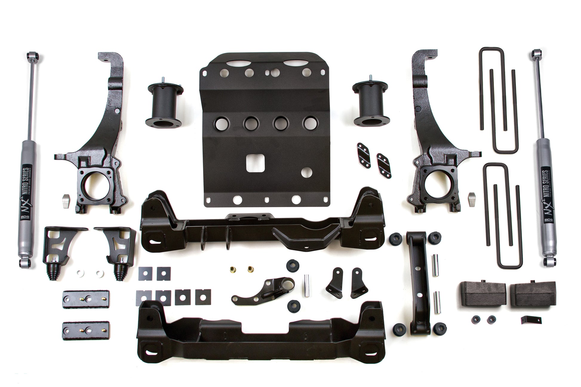 <p>This kit takes advantage of BDS's tried and true high-clearance design for improved ground clearance, strength, and offroad protection while correcting suspension and steering geometry for great on-road handling characteristics. Up front, the kit utilizes top mounted strut spacers, high-arched 1/4-inch thick steel crossmembers along with a multipiece differential relocation brackets and heavy duty skid plates built for offroad protection. Steering geometry is corrected at the new taller ride height with CNC-machined ductile iron steering knuckles utilizing factory tie rod ends allowing for ESC system compatibility. These combined with the provided sway bar drops, bump stop extensions, brake line brackets, lower control arm cams, supplied hardware and more provide a comprehensive front suspension lift ready for whatever you throw at it.</p>