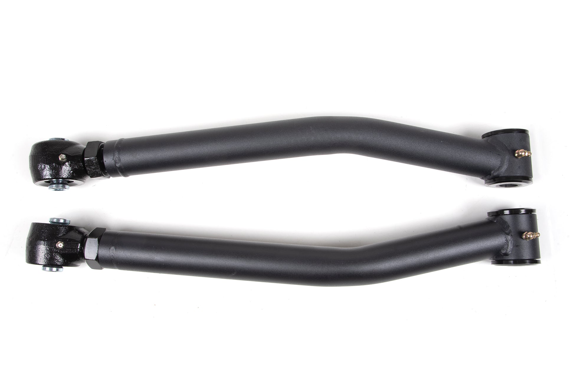 <p>At the axle end they utilize an OE-style poly bushing for long service-free operation and better isolation of noise, vibration, and harshness (NVH). At the frame mount they feature a large, forged flex end for strength, durability, and off-road articulation. The forged flex ends allow length adjustments to correctly position the front axle and correct caster. Capable of 15-degrees of misalignment in either direction for more flex out on the trail.</p>
