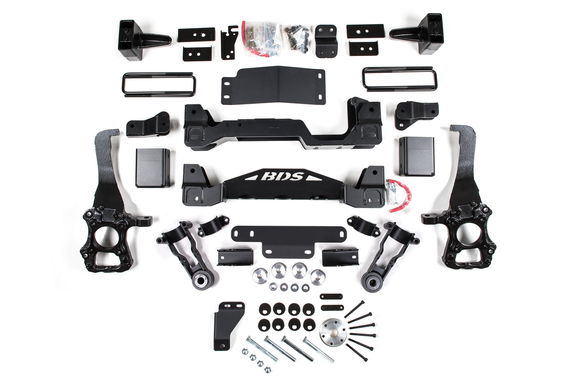 <p>This kit takes advantage of BDS's tried and true high-clearance design for improved ground clearance, strength, and offroad protection while correcting suspension and steering geometry for great on-road handling characteristics. Up front the kit utilizes high-arched 1/4-inch thick steel crossmembers, lower strut extension, multipiece differential relocation brackets and skidplate designed for offroad protection. Steering geometry is corrected at the new taller ride height with a pair of massive CNC-machined ductile iron steering knuckles. These combined with the provided sway bar relocation brackets, brake line brackets, alignment cam bolts, supplied hardware and more provide a comprehensive front suspension lift ready for use and abuse.</p>