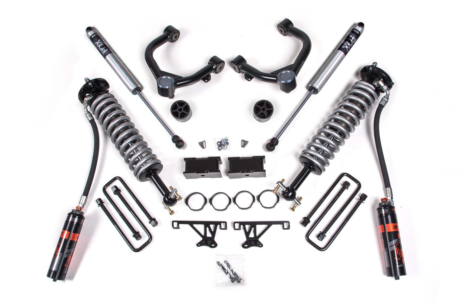 <p>Up front the lift kit includes FOX 2.5 Performance Elite Series remote reservoir coil-over shocks and heavy duty tubular upper control arms for increased strength. In the rear this kit utilizes fabricated steel lift blocks, longer u-bolts and a complementary set of FOX 2.0 Performance shocks for the smoothest ride.</p>