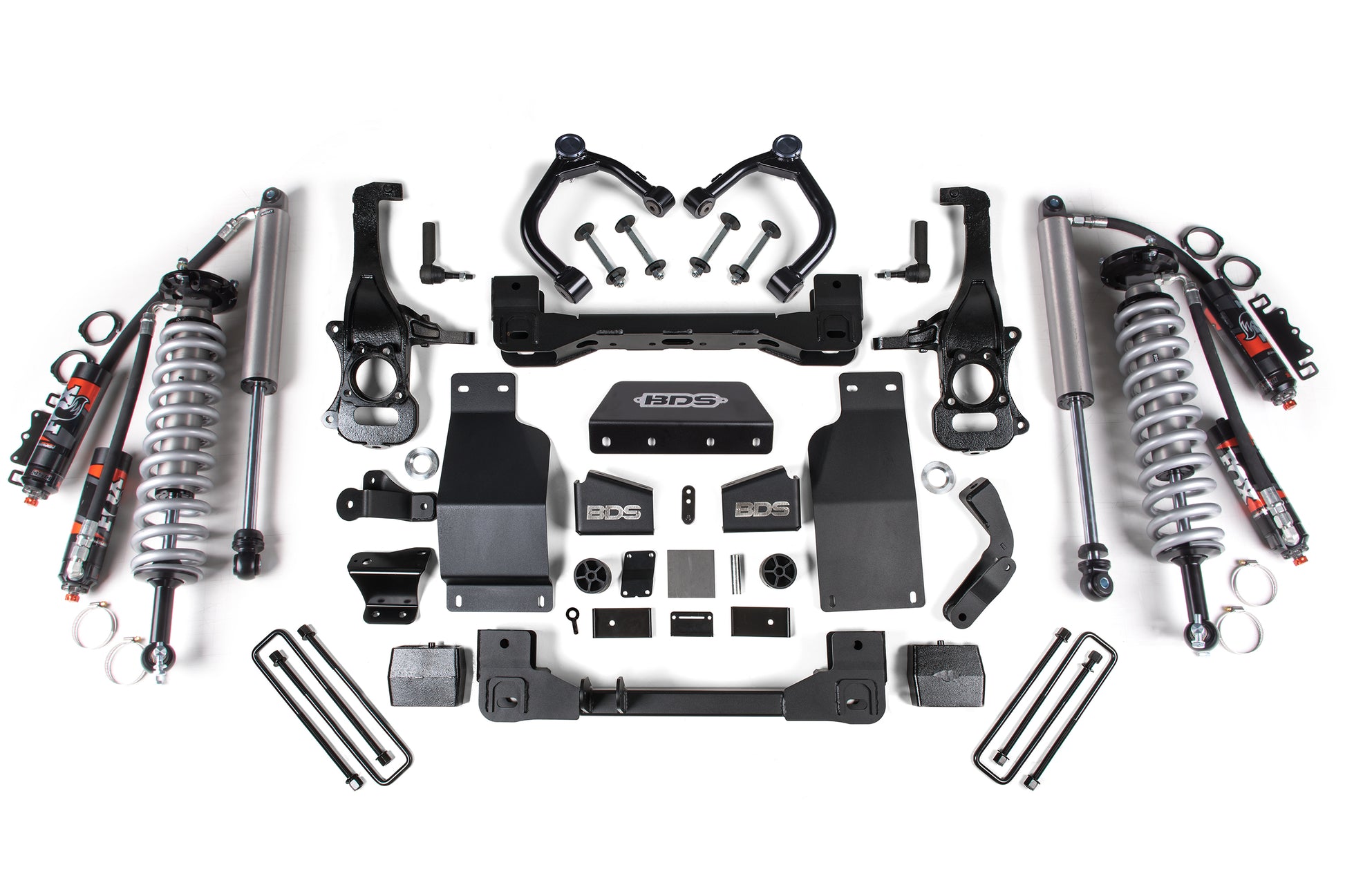 <p>This kit takes advantage of BDS's tried and true high-clearance design for improved ground clearance, strength, and offroad protection while correcting suspension and steering geometry for great on-road handling characteristics. Up front, the kit utilizes FOX 2.5 Performance Elite coil-over shocks, high-arched 1/4-inch thick steel crossmembers along with a multipiece differential relocation brackets and heavy duty skid plates built for offroad protection. Steering geometry is corrected at the new taller ride height with CNC-machined ductile iron steering knuckles and replacement tie rod ends allowing for ESC system compatibility. These combined with the provided sway bar drops, bump stop extensions, brake line brackets, CV spacers, supplied hardware and more provide a comprehensive front suspension lift ready for whatever you throw at it.</p>