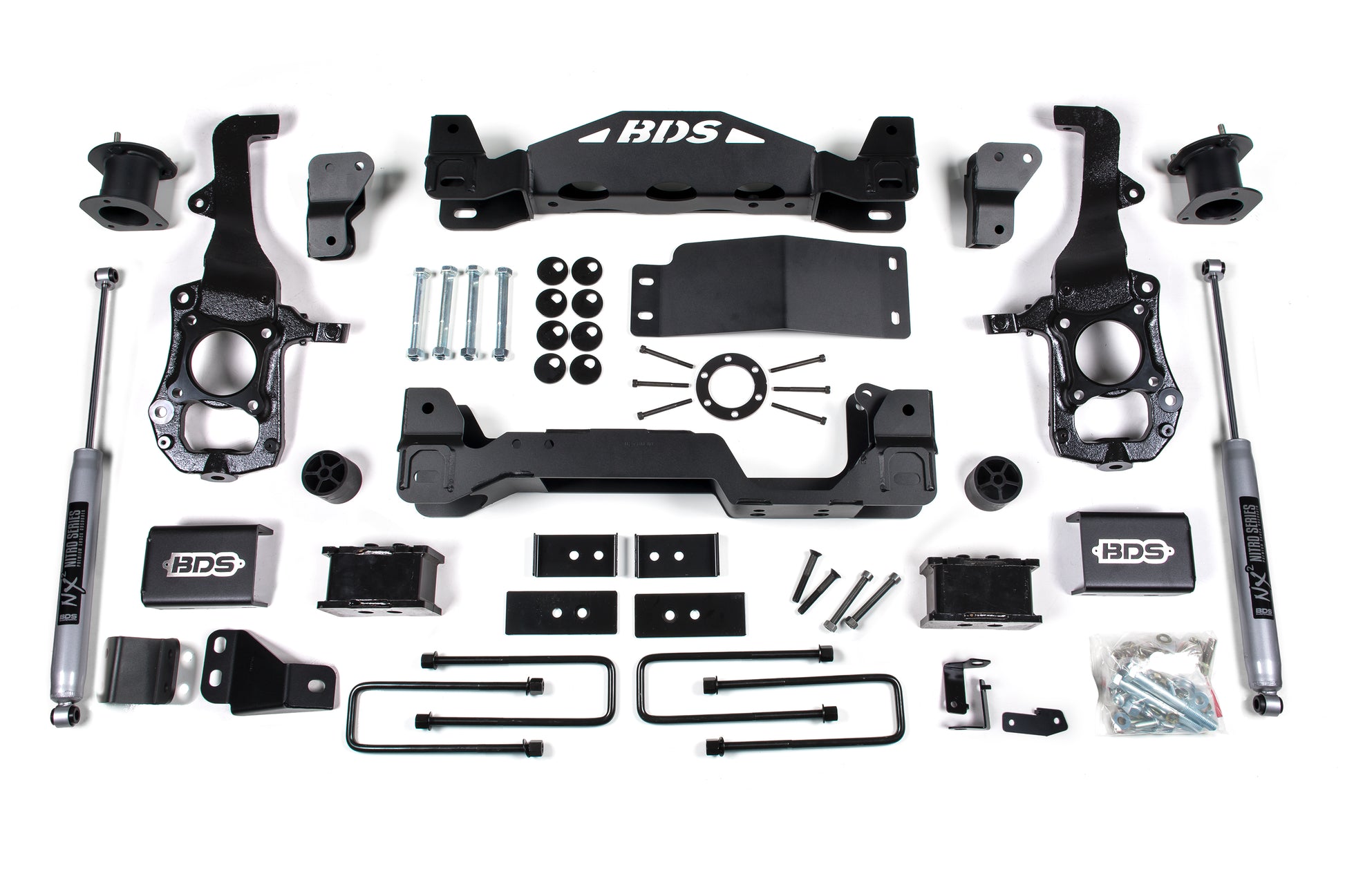 <p>In the rear BDS utilizes high strength fabricated lift blocks and longer u-bolts to lift and level the stance along and NX2 Nitro or optional FOX 2.0 Performance Series shocks.</p>