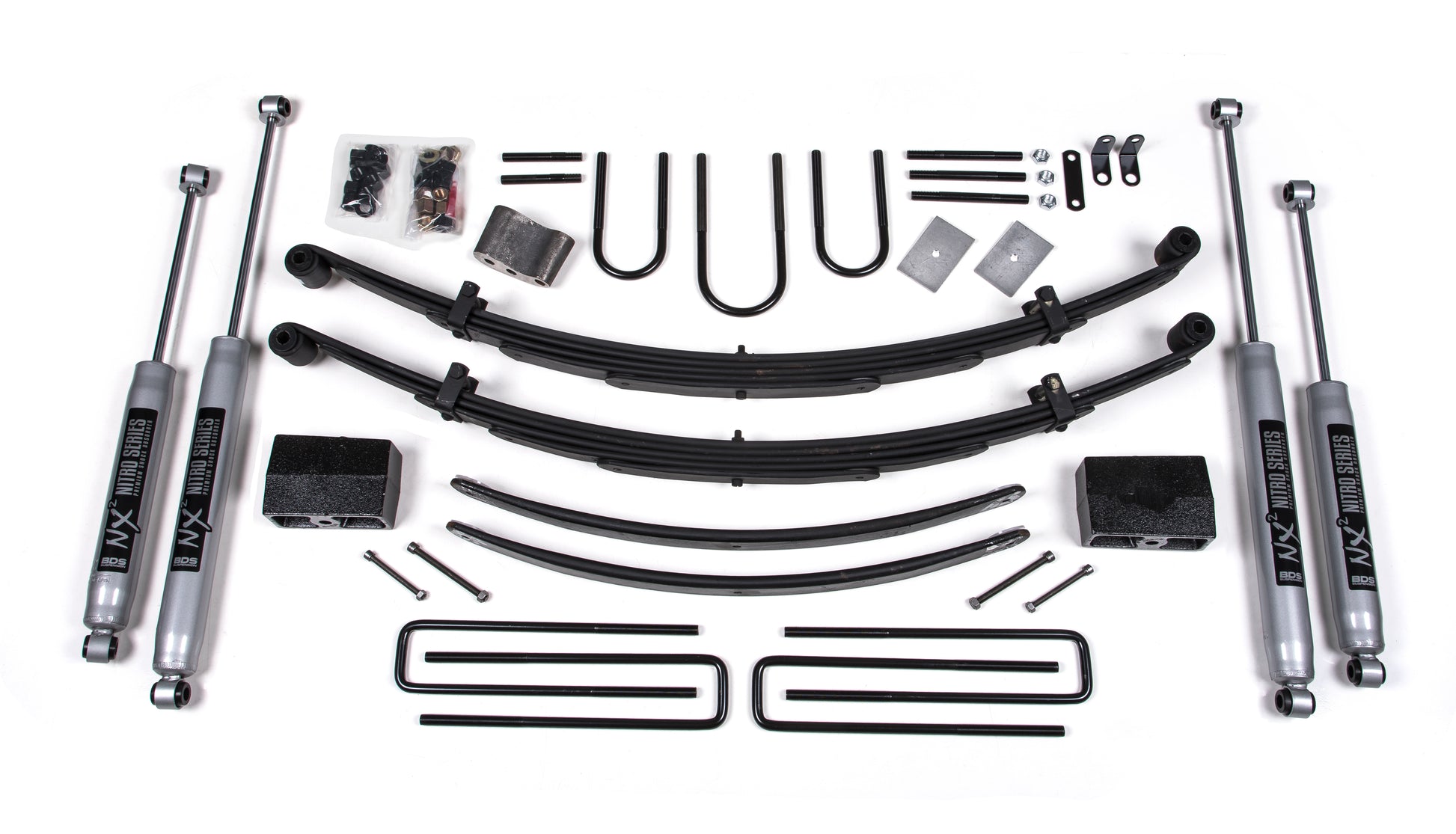 <p>Up front the lift kit includes Glide-Ride leaf springs, 3" steering block to correct steering linkage angles, and brake line brackets. In the rear this kit utilizes a high-strength lift blocks, add-a-leaf, and longer u-bolts. The round out these kits with your choice of specially tuned NX2 nitro series gas shocks or FOX 2.0 IFP performance series gas shocks to offer improved damper performance.</p>