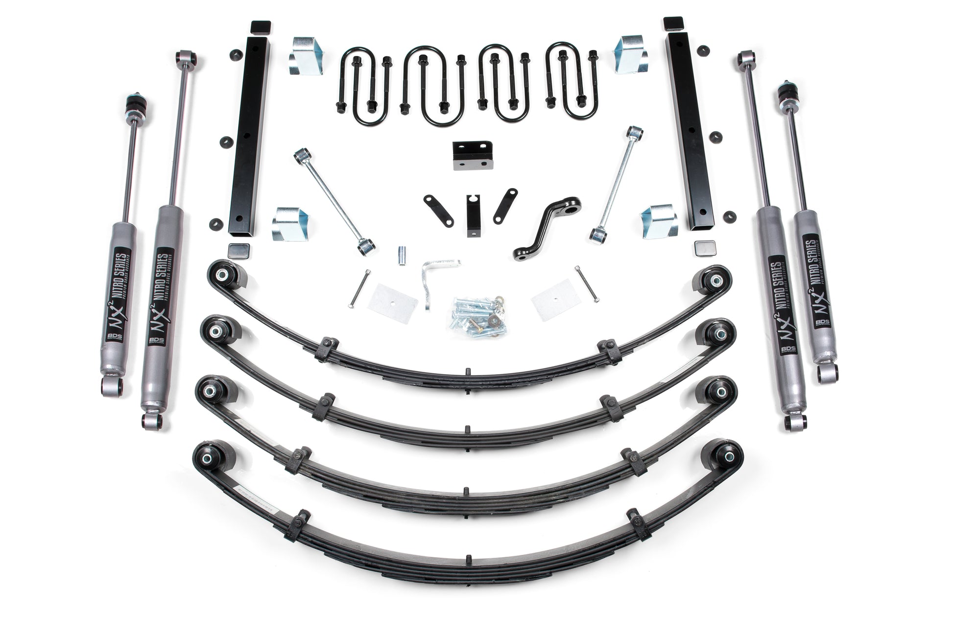 <p>This 3.5-inch lift kit includes front and rear Glide-Ride leaf springs with new u-bolts, front and rear track bar relocation brackets to center the axle, brake line brackets, power steering pitman arm, bump stop extensions, and a transfer case drop kit to ease the drive line angles. Round out this kit with specially tuned NX2 nitro series gas shocks to offer improved damper performance.</p>