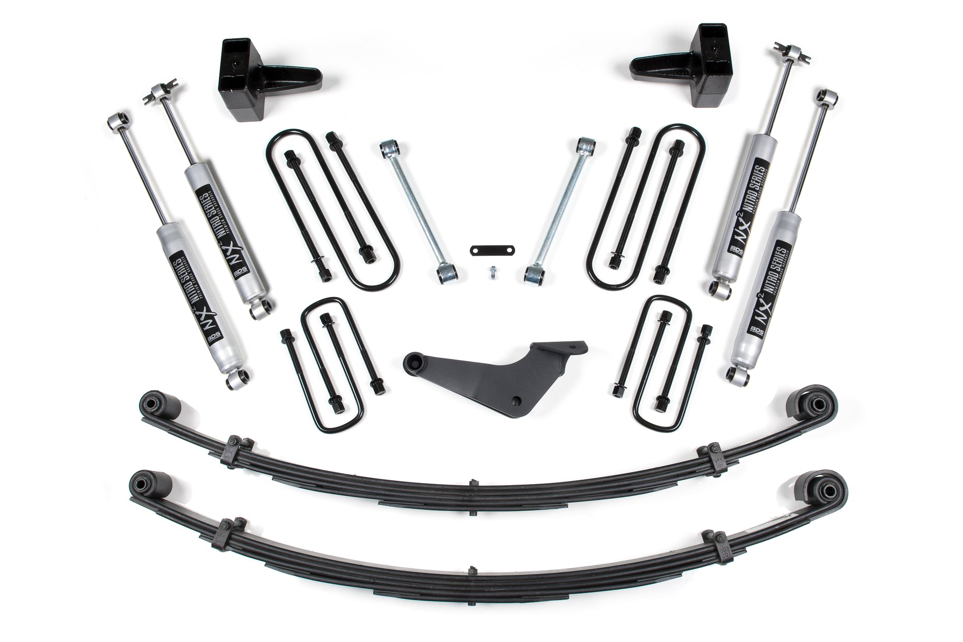 <p>Up front the lift kit includes Glide-Ride leaf springs, forged drop pitman arm and track bar bracket for steering correction, sway bar links, bump stop brackets and precision tuned NX2 or FOX nitrogen charged shocks.</p>