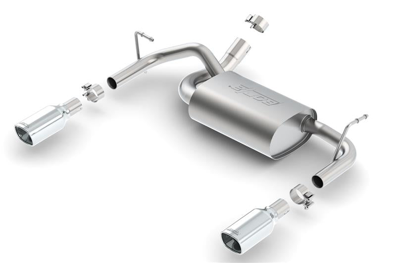 This 2.5" diameter into dual 2" Cat-Back™ system delivers the mellow Touring sound with no drone inside the vehicle The system features single 3.5" X 3.28" 'square' bright chrome on T-304 stainless steel tips on each tail pipe. BORLA® Cat-Back™ & Axle-Back exhaust systems feature patented straight-through and multi-core technology designed to unleash hidden horsepower. Increased exhaust velocity adds power, driving excitement, fuel economy, and the distinctive BORLA® Sound of Power respected by motoring enthusiasts everywhere. Each system is built from premium T-304 stainless steel, superior to T-400 series knockoffs (such as 409), to give you the absolute best in performance and durability. Ultra-smooth mandrel bends ensure maximum flow & power, and precision computer numerical control (CNC) manufacturing ensures an accurate fit. Best of all, BORLA® stands behind every system with a Million-Mile Warranty. Just what you’d expect from the world’s most experienced (and most winning) exhaust brand.