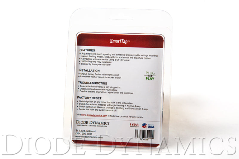 Features Adds unique, programmable functions Compatible with LED or standard bulbs, no hyperflash Plug and play swap for original module Assembled in USA, 3 year warranty A Smarter Flasher The SmartTap™ is a replacement turn signal flasher relay, compatible with any vehicle using a CF18 (LM449) Flasher. With plug-and-play installation, it offers a lot more than your average relay: an embedded microcontroller is loaded with exclusive software, which adds new features to your vehicle! You can program the features just the way you'd like, with the help of the included programming guide. Tap-to-Signal: Anytime the turn signal is tapped, the turn signal will blink a number of times automatically. This one-touch signaling is a convenient way to signal other drivers when switching lanes. The number blinks is programmable, to make it as long or short as you'd like. Unique Hazard Functions: The SmartTap™ has built-in strobe, slo-mo and wig-wag hazard functions to help your vehicle stand out when the hazards are on. Apply these functions on their own, together, or with the strobe setting for a total of eight unique hazard functions! Arrival and Departure Modes: When the lock or unlock button is pressed, your turn signals will stay on in a steady glow, for better visibility when approaching or leaving the vehicle at night. The lighting time can be adjusted from 10-90 seconds for additional illumination, or disabled if desired. This product was designed, programmed, and assembled by Diode Dynamics, in St. Louis, Missouri, USA.