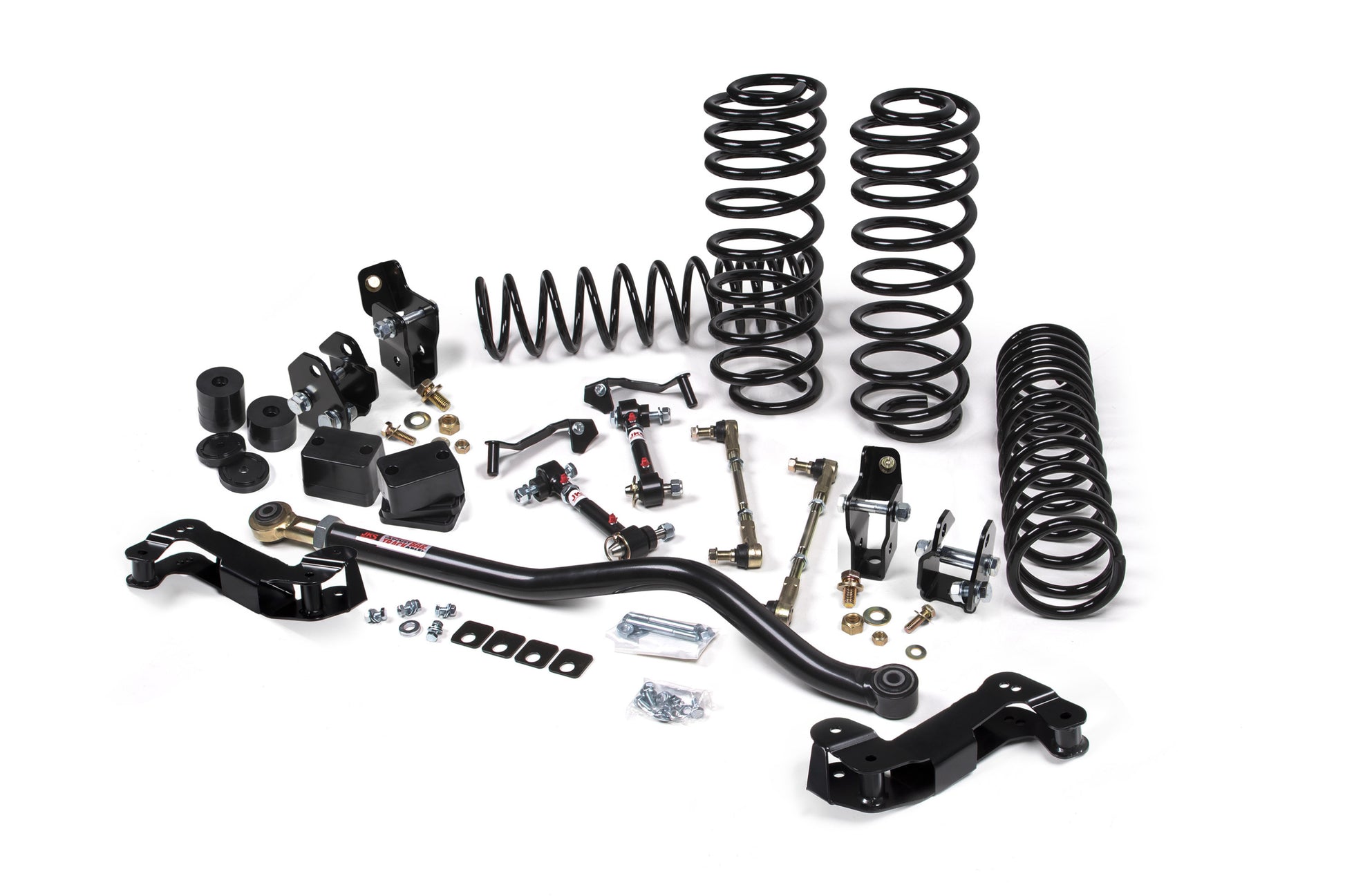 Increase the clearance and performance of your 4-Door Jeep Wrangler JL with a 2.5" lift J-Kontrol™ suspension system. It delivers exceptional stability on and off road. A step up from JKS J-Venture™ systems, J-Kontrol™ is a true bolt-on system that adds in front control arm correction brackets to the J-Venture Kit's long list of upgrade components including JSPEC dual-rate coil springs, an adjustable front track bar and rear track bar bracket (to correct axle positioning under vehicle), Quicker-Disconnect sway bar end links, front/rear Bump Stop Extensions and front Control Arm Correction Brackets to flatten upper/lower control arm angles. The supplied control arm brackets work with your Jeep's stock control arms to correct caster and improve handling. J-Kontrol offers enhanced performance for daily driving, beach cruising, or regular trail use.