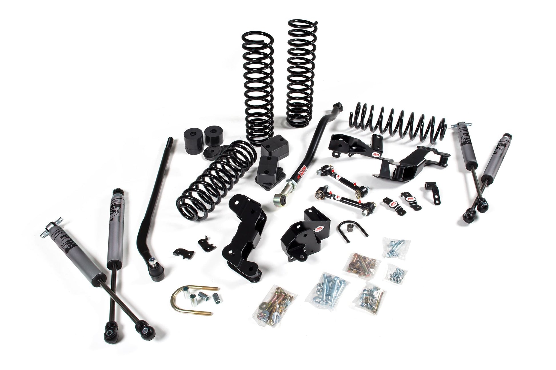 Increase the clearance and performance of your 4-Door Jeep Wrangler JK with a 3.5" lift J-Kontrol™ suspension system for exceptional stability on and off road. A step up from JKS J-Venture systems, J-Kontrol™ is a true bolt-on system that adds in front control arm correction brackets and a drag link flip kit to the J-Venture Kit's components including JSPEC dual-rate coil springs, custom-valved FOX Performance Series shocks, an adjustable track bar, Quicker-Disconnects, and more. Take control with J-Kontrol. The supplied control arm brackets further enhance on-road handling by flattening out the control arm to more closely mimic factory geometry while correcting caster. The Drag Link Flip Kit flattens the steering angle to mimic factory geometry. J-Kontrol offers enhanced performance for daily driving, beach cruising, or regular trail use.