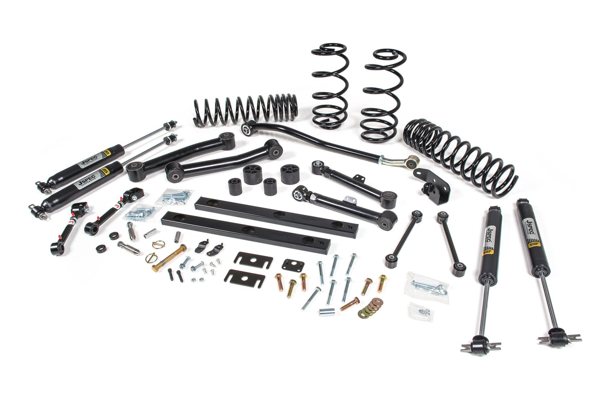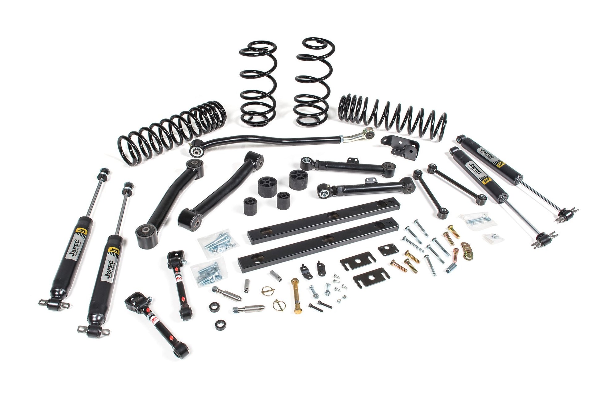 Improve the ride and fit larger tires on your Jeep Wrangler TJ or LJ by installing the JKS 3" suspension system. In addition to the added clearance, you'll be thoroughly impressed with the ride quality and handling improvements. The JKS 3" lift kit includes custom tuned JSPEC dual rate coil springs, sway bar Quicker disconnects, front adjustable track bar, bump stop extensions, J-Link front lower control arms, J-Flex rear upper control arms, heavy duty rear track bar bracket, rear sway bar links, and a set of custom-valved JSPEC gas shocks. Now TJ owners can enjoy the benefits of a complete JSPEC suspension system outfitted with the most popular JKS suspension components. This is the most the best riding 3” lift kit available on the market today. Why buy mismatched parts when you can have complete, custom matched JKS suspension system? <a href=" http://www.drivingline.com/articles/jks-jspec-3-inch-suspension-review/" target="_blank">Check out the Install Article by Driving Line</a>