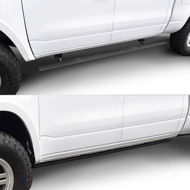 Introducing the all-new Westin Pro-e Power Running Boards, a superior upgrade that combines the functionality and appearance of your Truck, Bronco, Jeep or SUV. The Pro-e Power Running Boards are designed with a practical feature that automatically deploys when the vehicle's door is opened. This allows for easy entry and exit. When the door is closed, the running boards smoothly retract, seamlessly integrating with the vehicle's body and maintaining its sleek appearance.Equipped with two waterproof IP68 rated motors per side, these running boards are engineered for durability and reliability in any weather condition. The integrated LED lights illuminate the 6-inch wide, durable aluminum step surface, ensuring enhanced visibility and safety. Whether it's day or night, you can confidently step onto these running boards with their impressive weight capacity of up to 300 lbs. per side.The Pro-e Power Running Boards are constructed from corrosion-resistant aluminum and finished with a durable textured black powder coat. The included vehicle-specific mounting brackets and hardware guarantee a seamless installation process, ensuring a perfect fit for your vehicle.