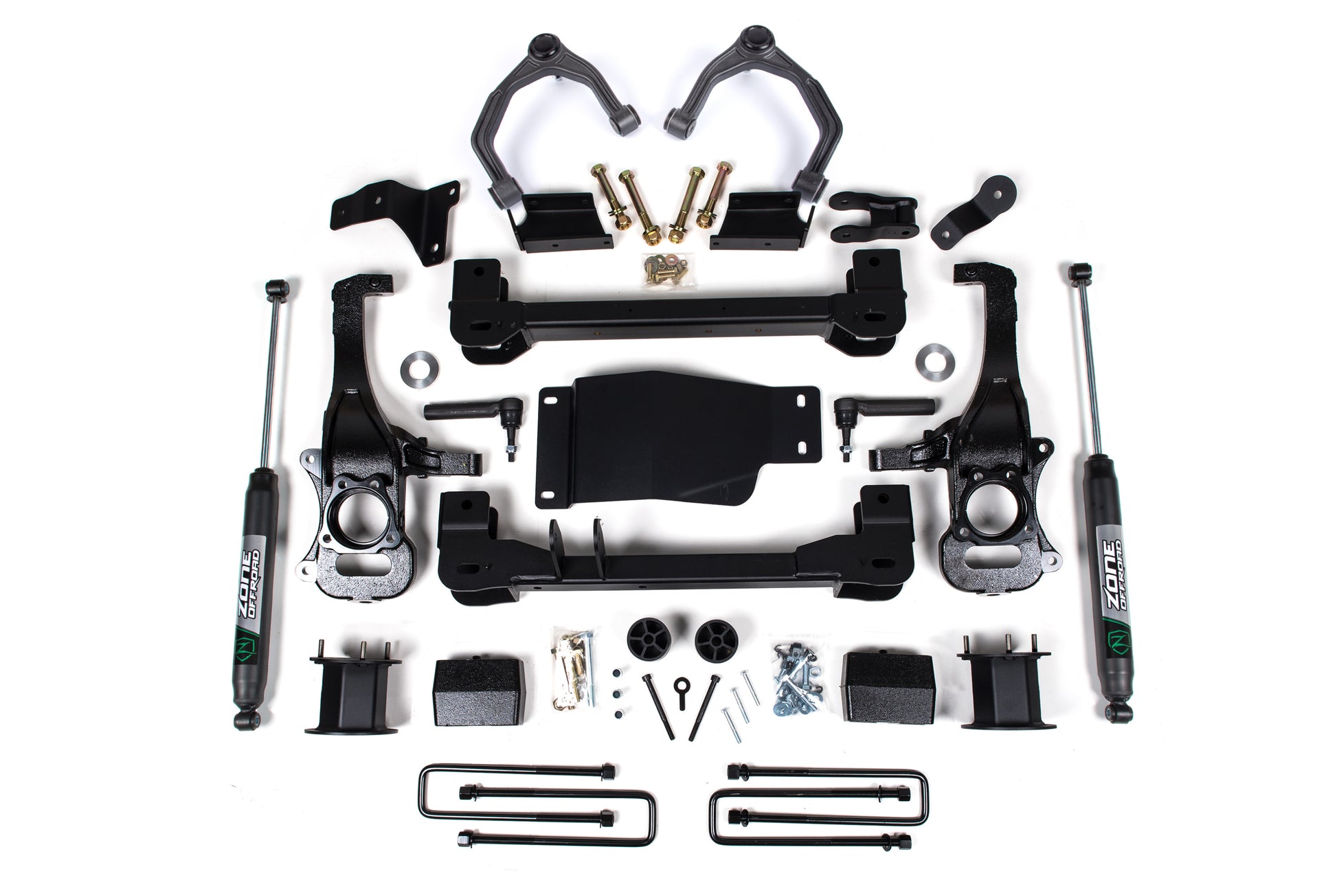 Take your Silverado/Sierra 1500 to new heights with this 4" lift kit from Zone Offroad. Kits include everything needed from high strength crossmembers and steering knuckles to strut spacers, Adventure Series upper control arms and differential relocation brackets to maintain driveline angles. Get the look, performance, and capability your truck deserves with clearance for up to 35" tires.